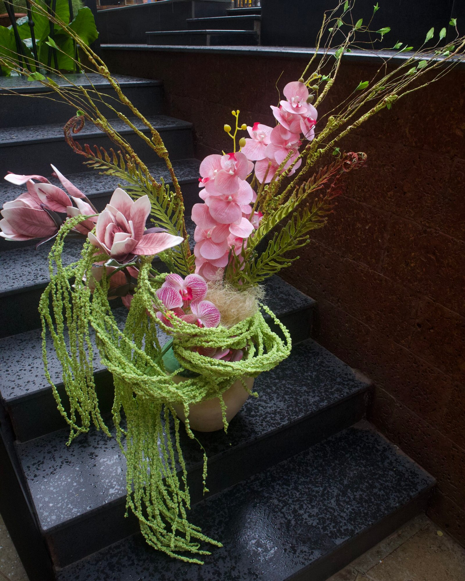 Graceful pink blooms paired with trailing greens and fresh foliage, beautifully arranged in a stylish vase.