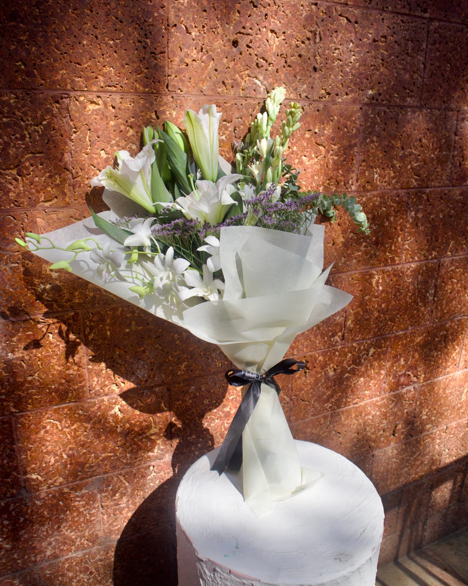 An elegant bouquet of lilies and tuberose with purple accents, beautifully wrapped in white for a refined, timeless look.