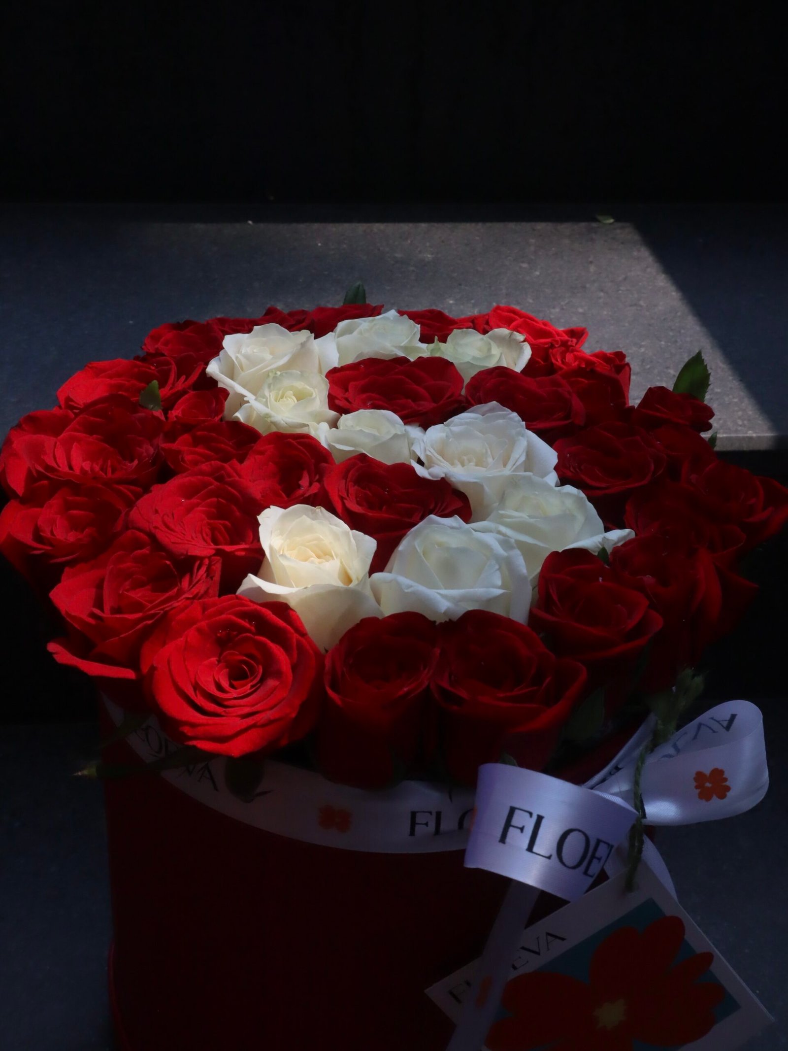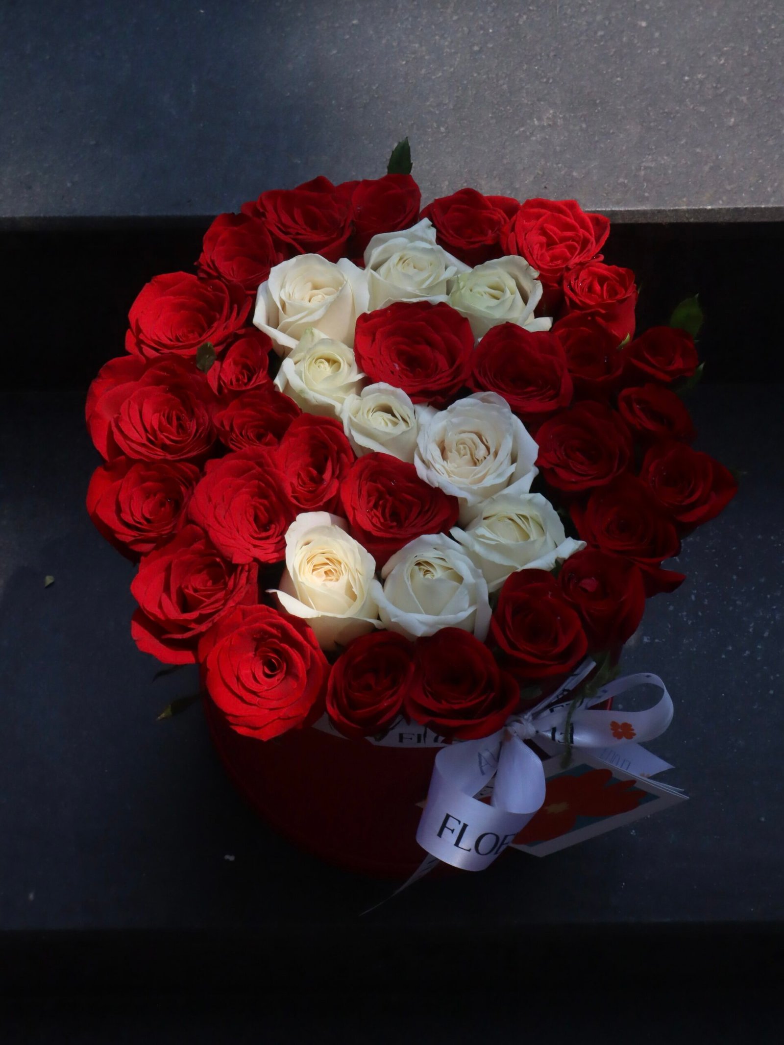 A personalized floral arrangement shaped as your chosen letter, featuring classic red and white roses in perfect harmony.