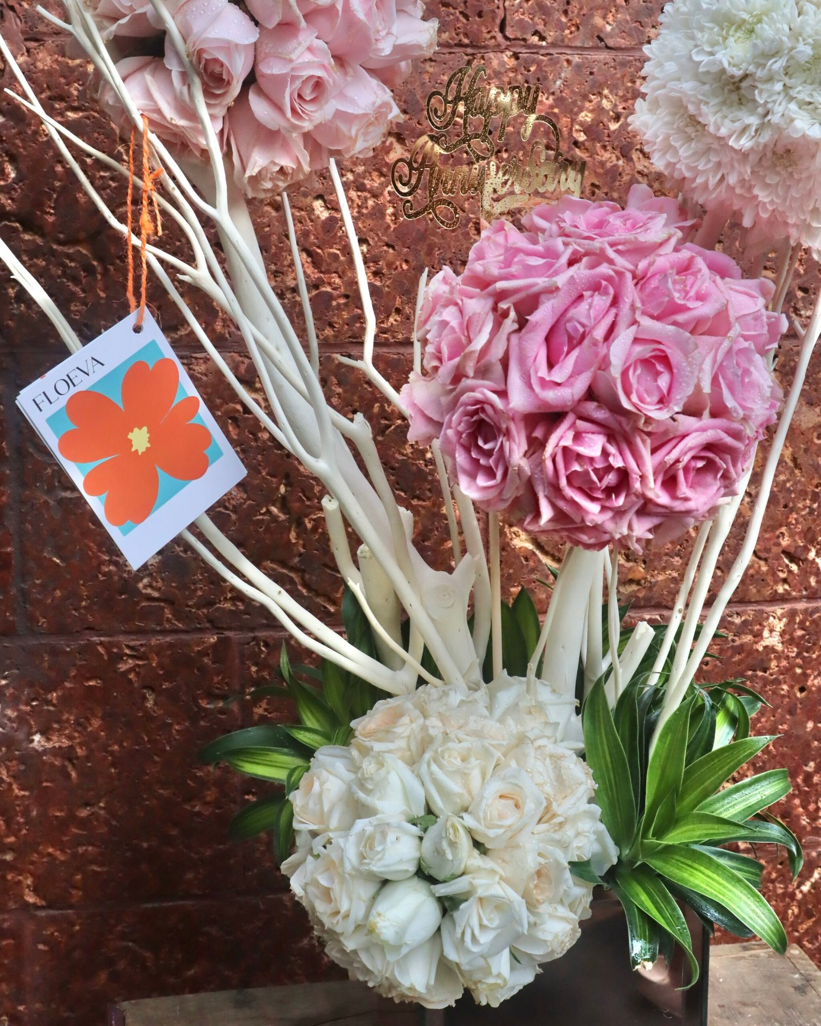 A delightful mix of pink, white, and soft blush roses paired with vibrant greenery for a charming and fresh floral display.