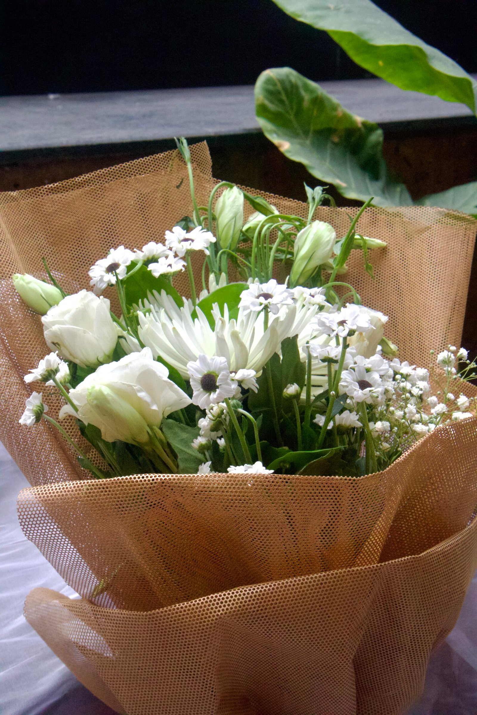 A serene bouquet of white daisies, chrysanthemums, eustoma, and baby’s breath.