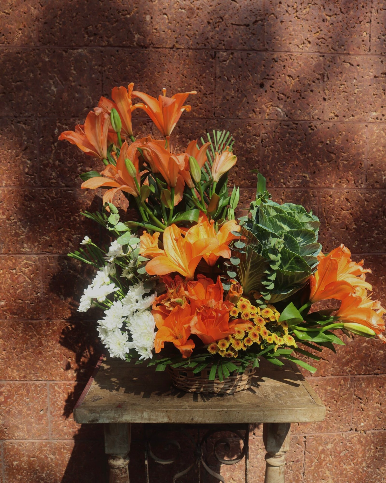 Featuring bold orange oriental lilies, cheerful chrysanthemums, and fresh eucalyptus