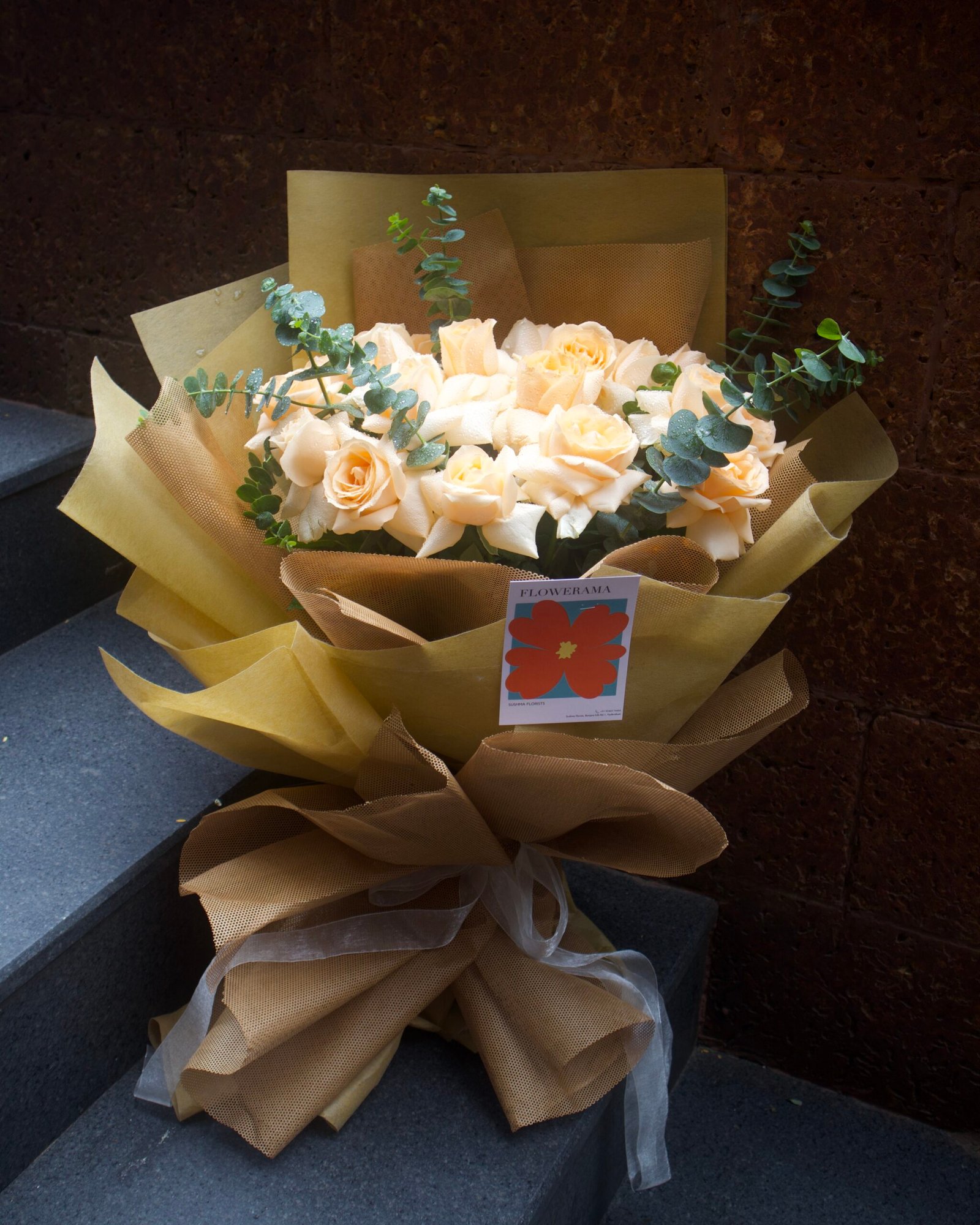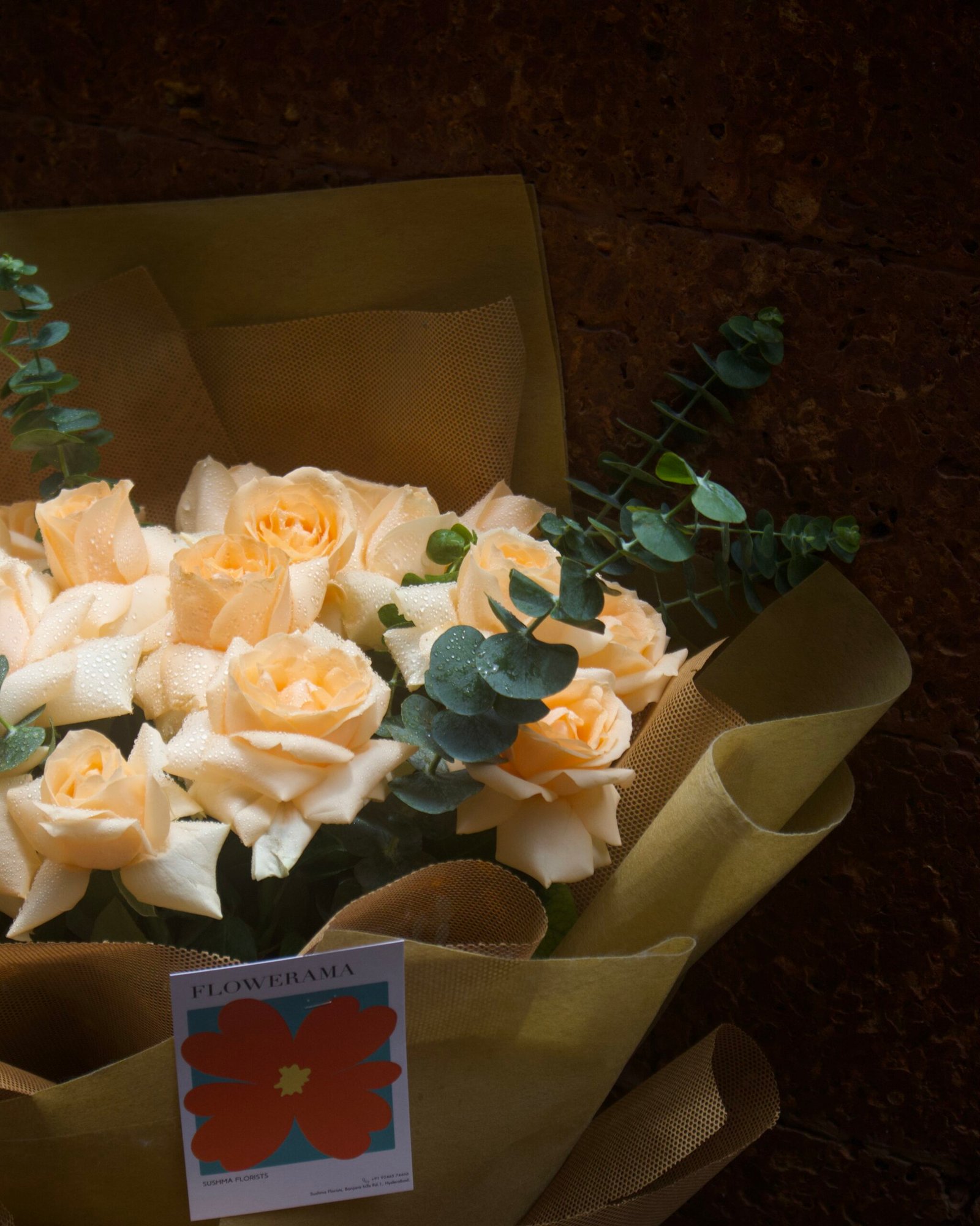 A graceful bouquet of peach roses with eucalyptus greens, wrapped in golden brown