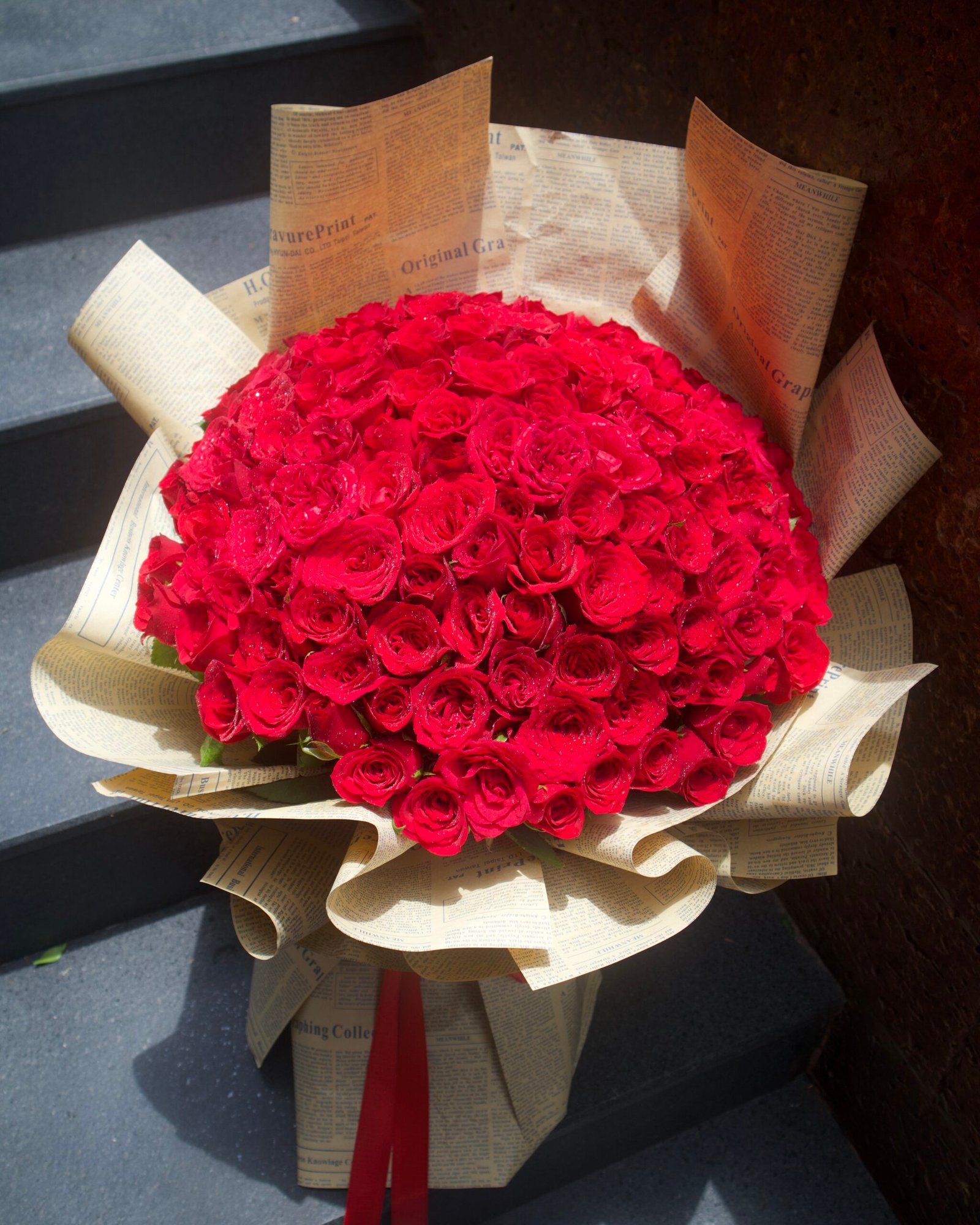 A breathtaking bouquet of 150 red roses, wrapped in rustic brown for a bold yet elegant statement of love.