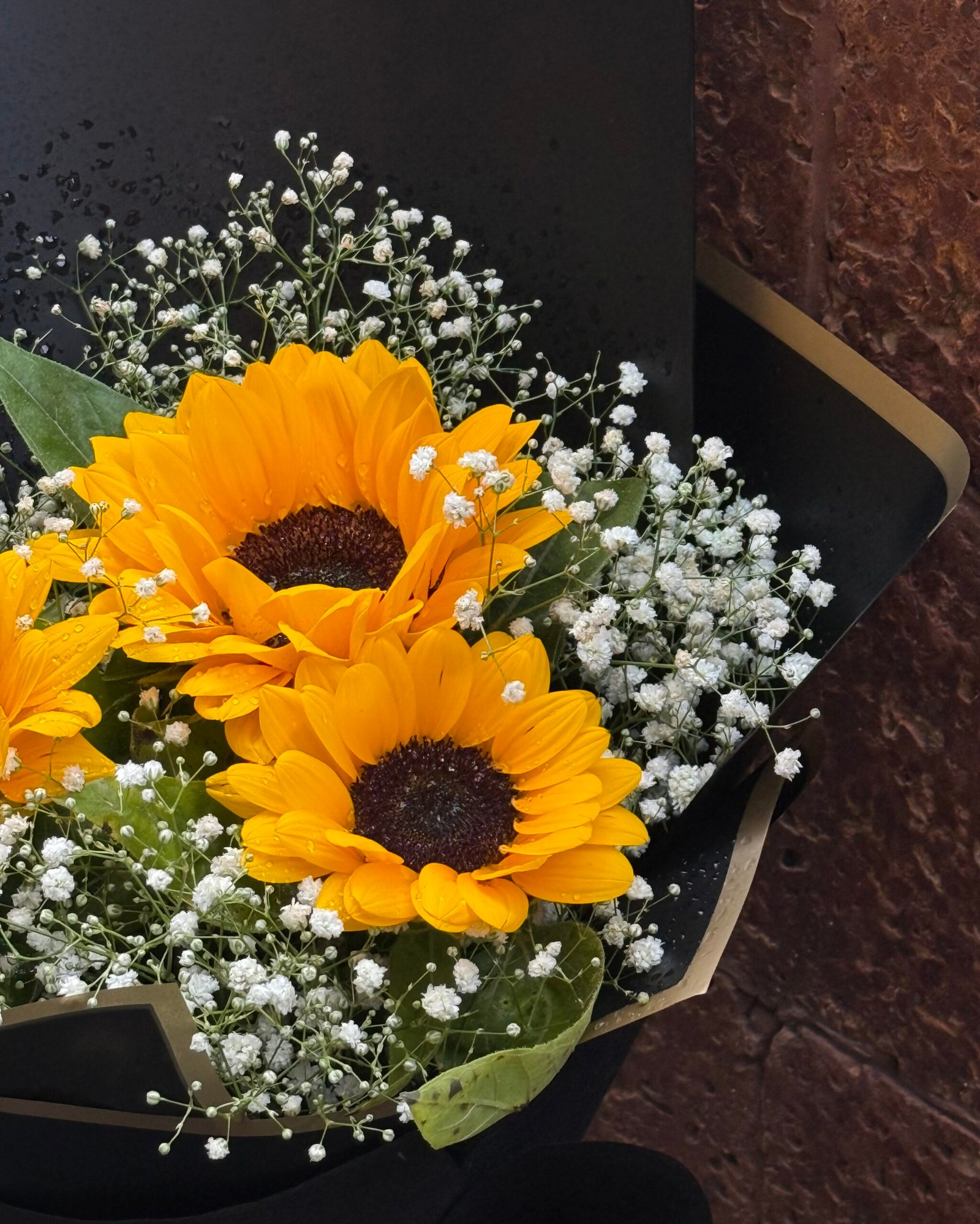 A bouquet of 3 golden sunflowers with baby’s breath, wrapped in sleek black for a modern, stylish finish.