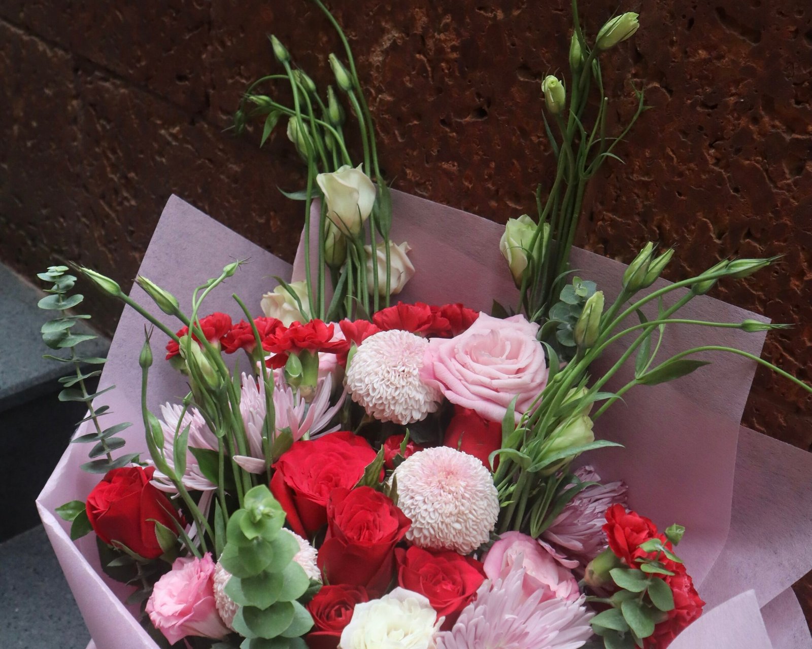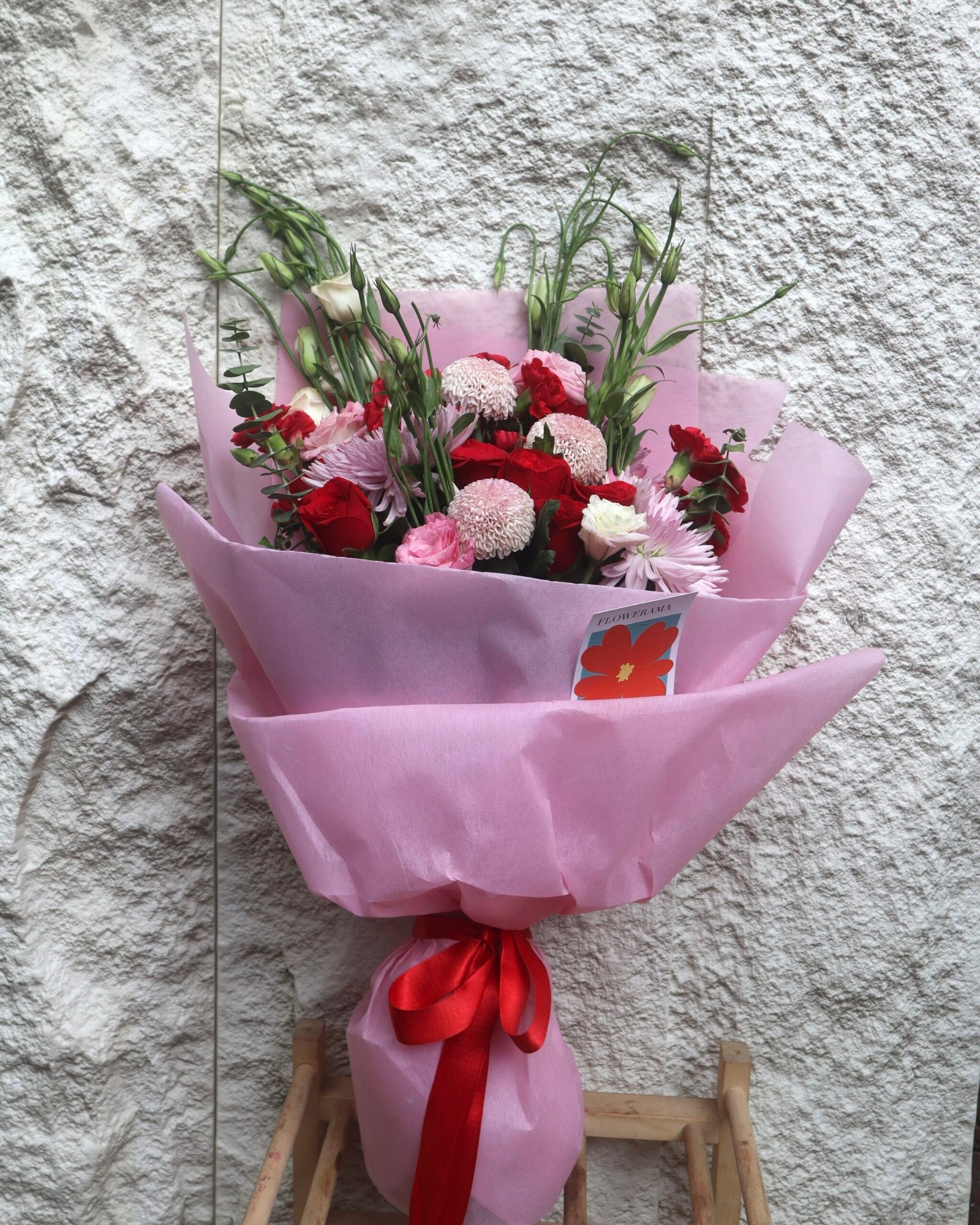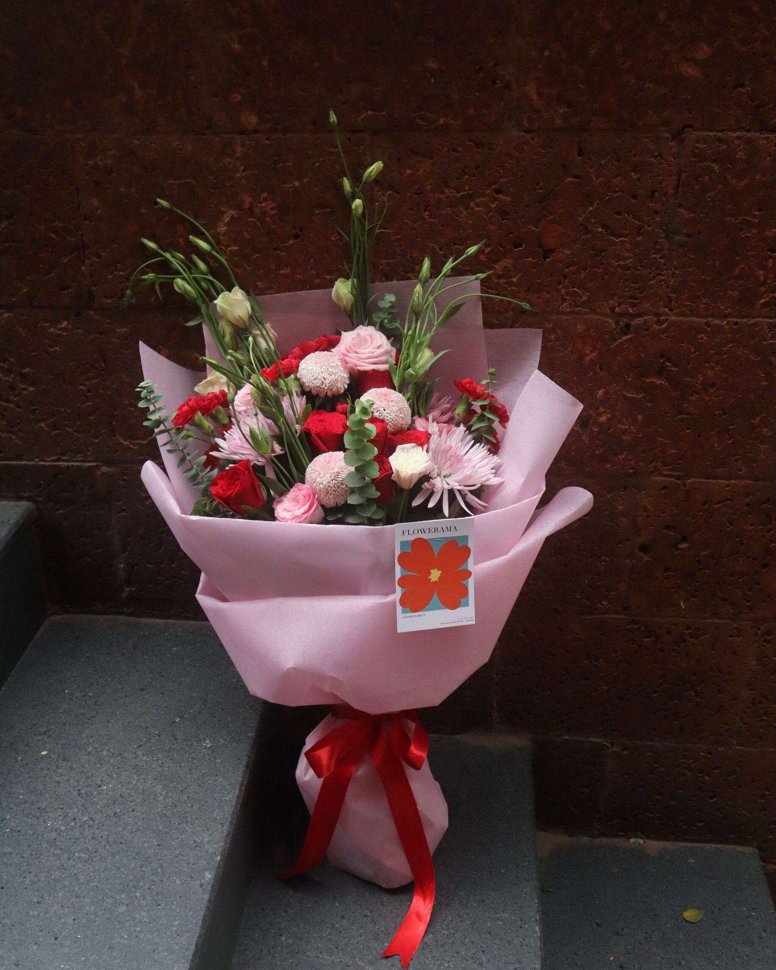 A chic bouquet of pink, red, and white blooms with lush greens, wrapped in soft pink and tied with a red satin ribbon